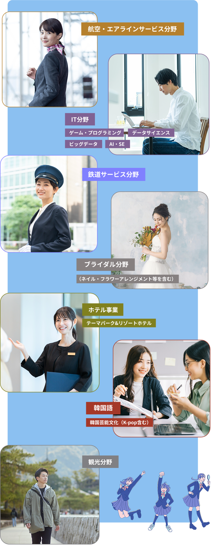 医療福祉・医療衛生・IT・情報・プログラミング・ゲーム・観光・服飾・自動車・動物福祉・鉄道・教育福祉・調理・調理製菓・スポーツ・建設系・音楽/アミューズメント・簿記系・コンピュータ等の専門学校
