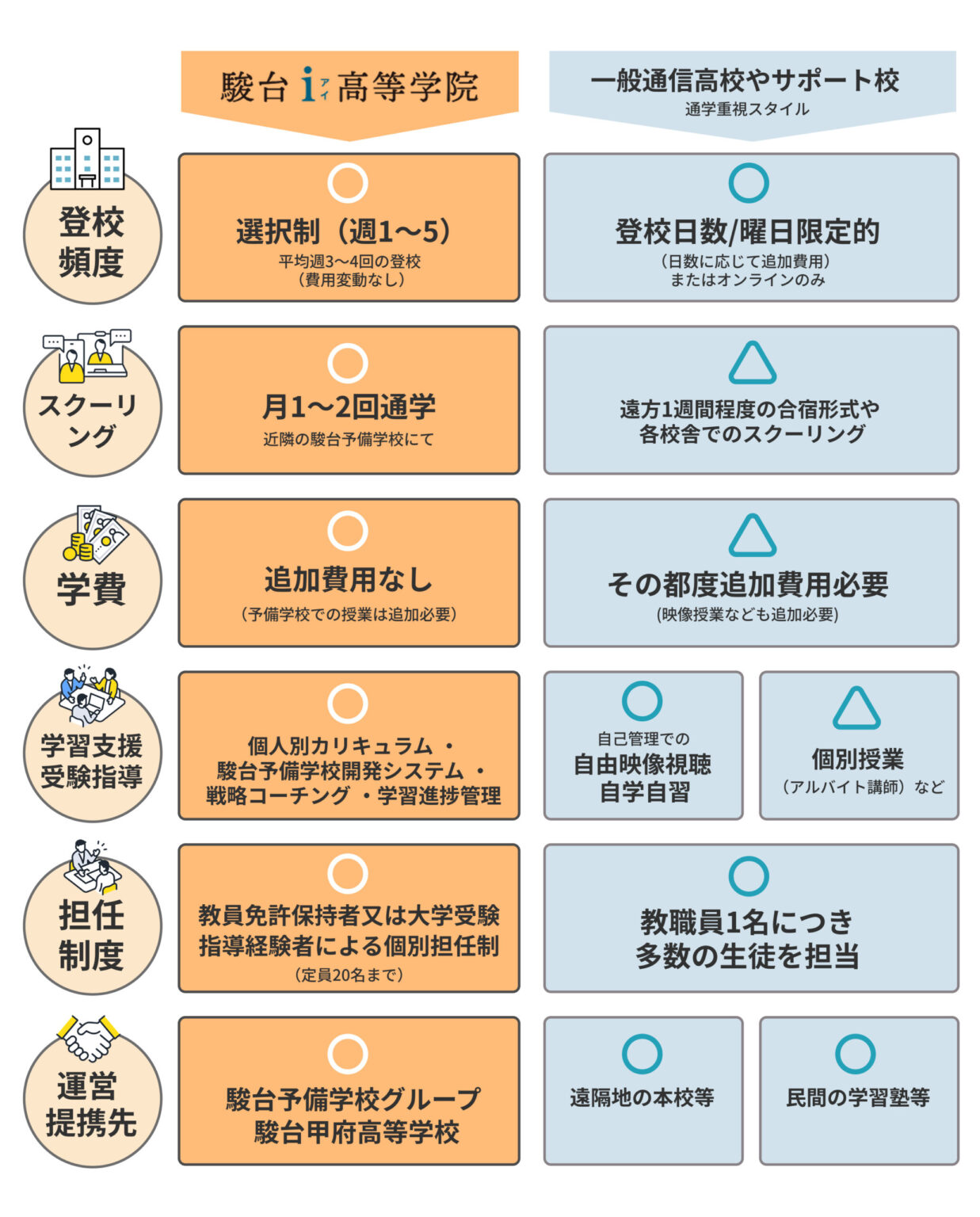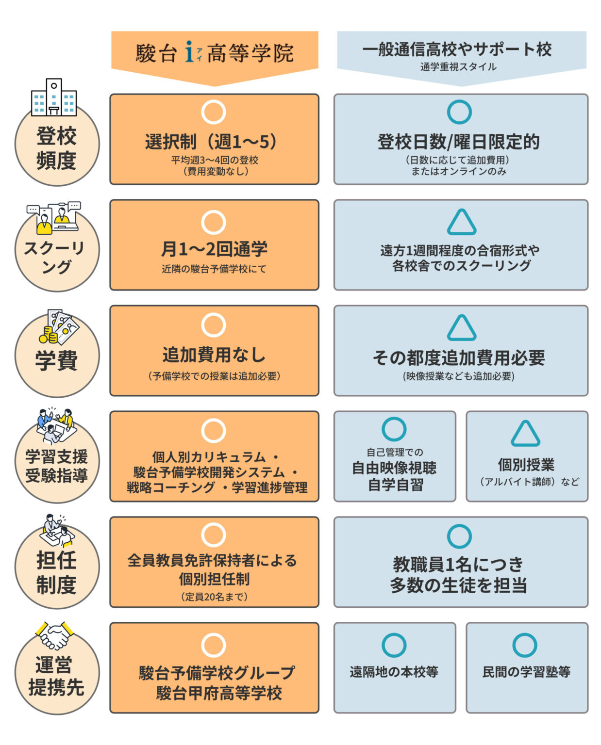 駿台i高等学院は、「駿台予備学校」「駿台専門学校」「駿台国際教育センター」の教育リソースを活かし、通学型+進学特化型+個別最適化を実現している通信制サポート校です。映像授業に頼りすぎず、教員免許保持者の担任が学習に関して進捗管理、アドバイスを行っている点が大きな違いです。