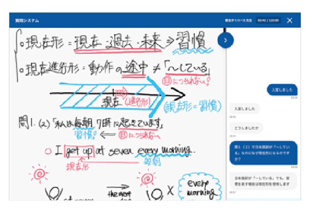 質問をシステムにアップ→先生(優秀な学生)が立候補→先生の解説をタブレット上で見ることができる。