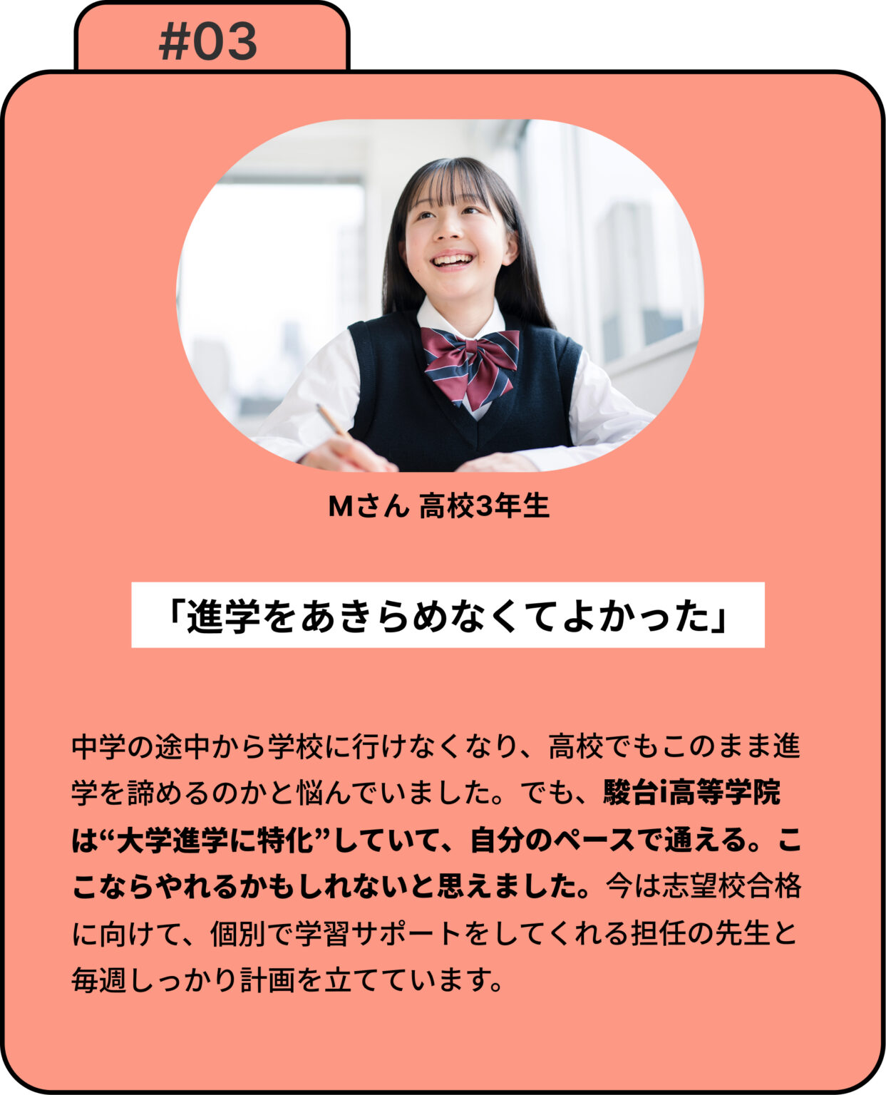 駿台i高等学院は、自分のペースで学びながら行きたい大学を目指せる進学専門の通信制サポート校です。