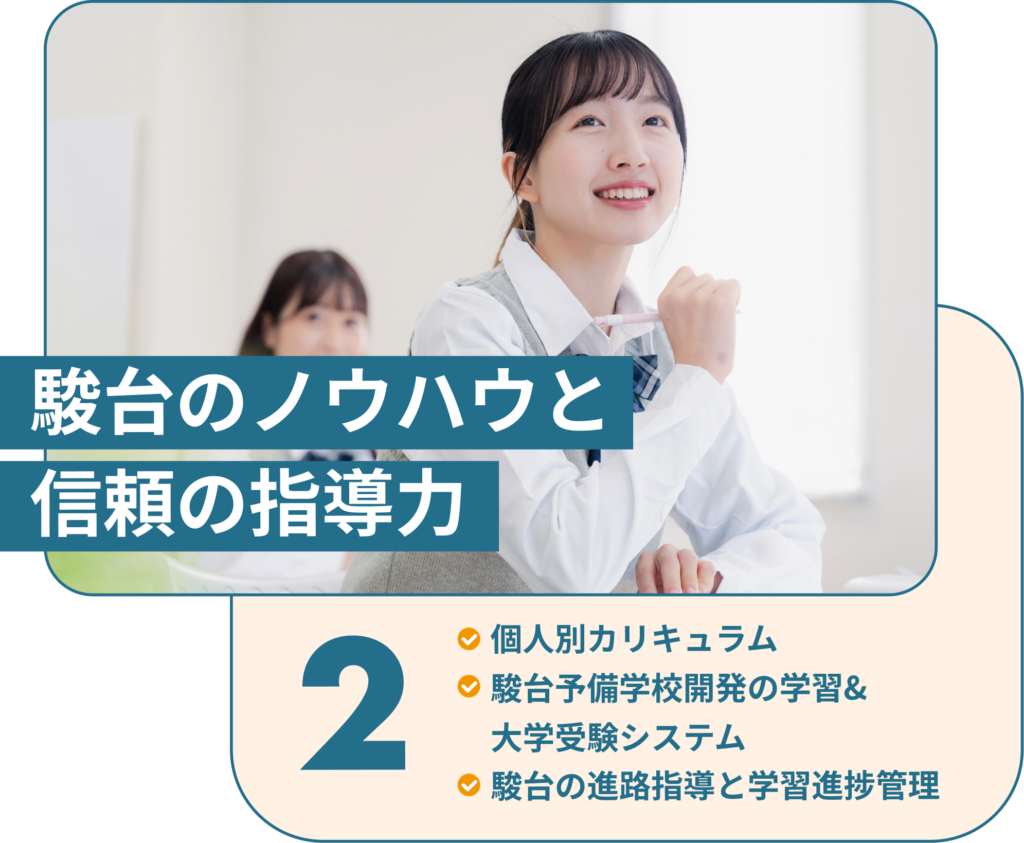 大学進学を明確な目標として、一人ひとりに駿台メソッドに基づく個別学習計画・逆算スケジュールを設定し、進捗サポートを行います。